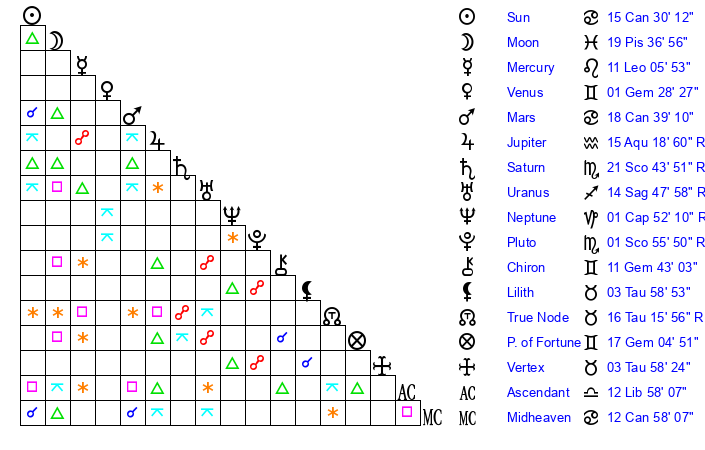 | Moon | 19 Pisces 42 | 9 Sagittarius 30 | 27 Leo 29 |