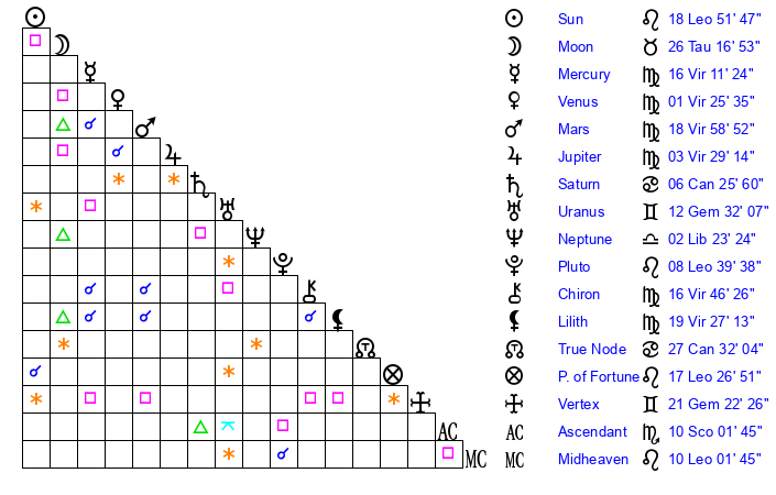 | Pluto | 8 Leo 39 | 2 Aquarius 10 | 10 Leo 14 |
