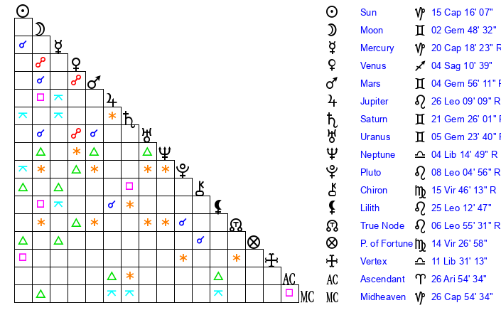 | Neptune | 4 Libra 16 | 27 Pisces 23 | 2 Libra 46 |