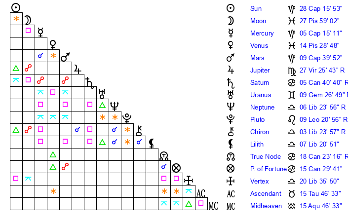 | Moon | 27 Pisces 53 | 24 Virgo 40 | 25 Aquarius 9 |