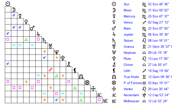 | Moon | 21 Scorpio 58 | 0 Capricorn 6 | 17 Libra 54 |