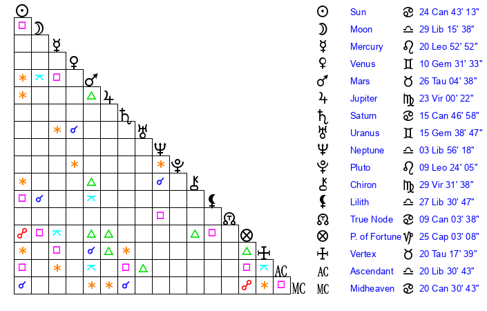 | Sun | 24 Cancer 43 | 25 Cancer 22 | 12 Libra 5 |