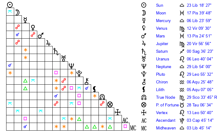 | Moon | 17 Pisces 41 | 29 Leo 20 | 6 Libra 23 |