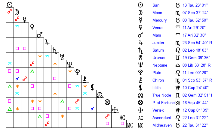 | Moon | 7 Scorpio 29 | 16 Leo 8 | 17 Virgo 27 |