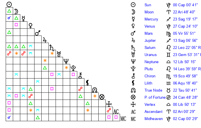 | Moon | 22 Aries 50 | 0 Aquarius 40 | 6 Pisces 1 |