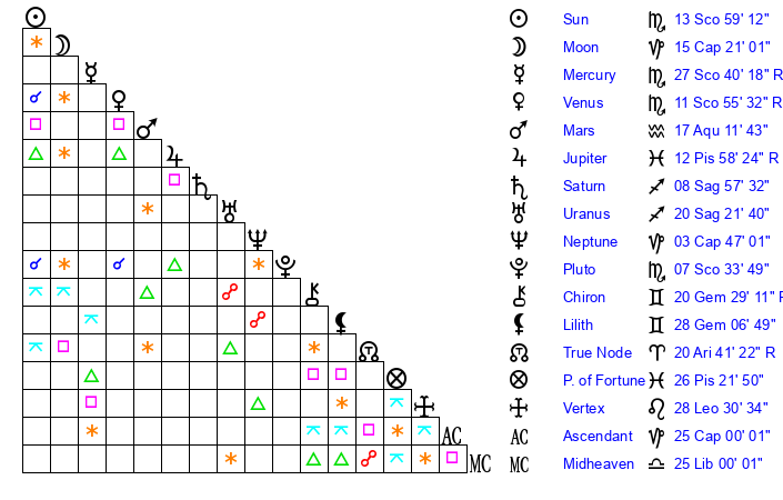 | Saturn | 9 Sagittarius 10 | 25 Pisces 27 | 13 Sagittarius 42 |