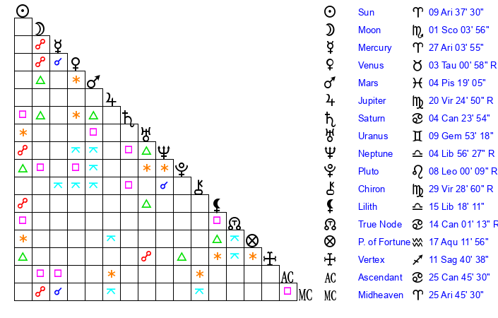 | Moon | 1 Scorpio 3 | 27 Aries 55 | 9 Libra 26 |