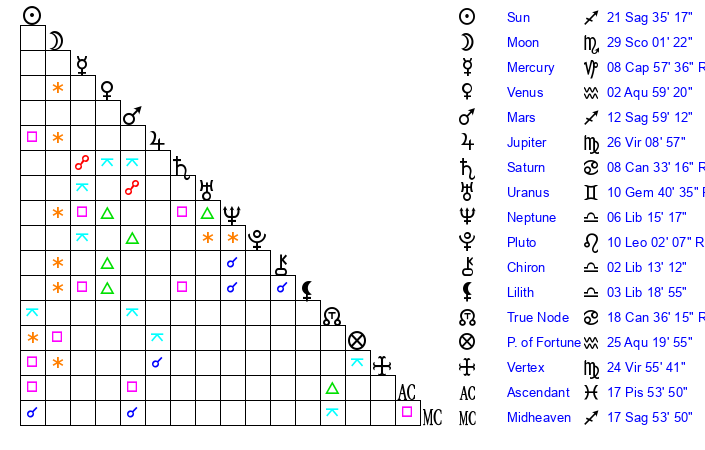 | Sun | 21 Sagittarius 35 | 21 Sagittarius 56 | 13 Pisces 46 |