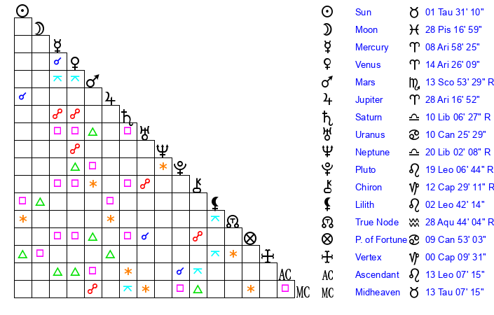 | Saturn | 10 Libra 41 | 26 Pisces 47 | 9 Libra 10 |