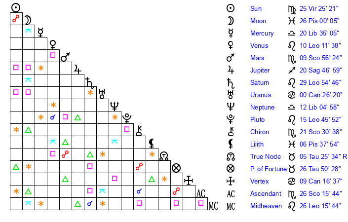 | Saturn | 0 Virgo 21 | 28 Pisces 36 | 6 Virgo 32 |