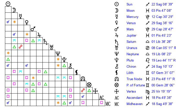 | Sun | 22 Sagittarius 9 | 22 Sagittarius 57 | 8 Pisces 18 |