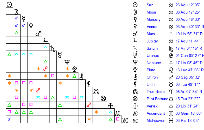 | Venus | 3 Aquarius 41 | 6 Aries 58 | 25 Pisces 18 |