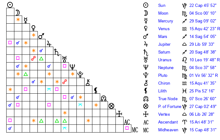 Moon | 3 Scorpio 56 | 17 Cancer 32 | 11 Aries 37 |