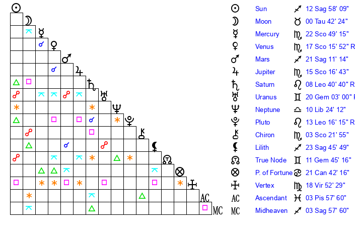 | Sun | 12 Sagittarius 58 | 13 Sagittarius 49 | 3 Pisces 14 |