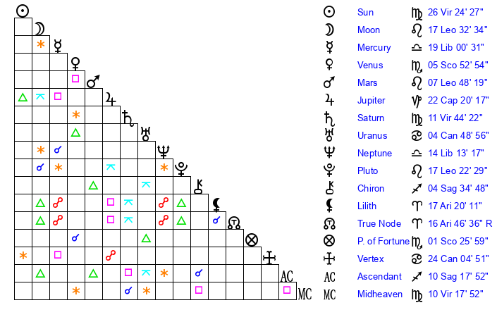 | Sun | 26 Virgo 25 | 27 Virgo 0 | 12 Sagittarius 14 |