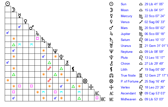 | Moon | 14 Libra 58 | 24 Scorpio 27 | 7 Virgo 46 |