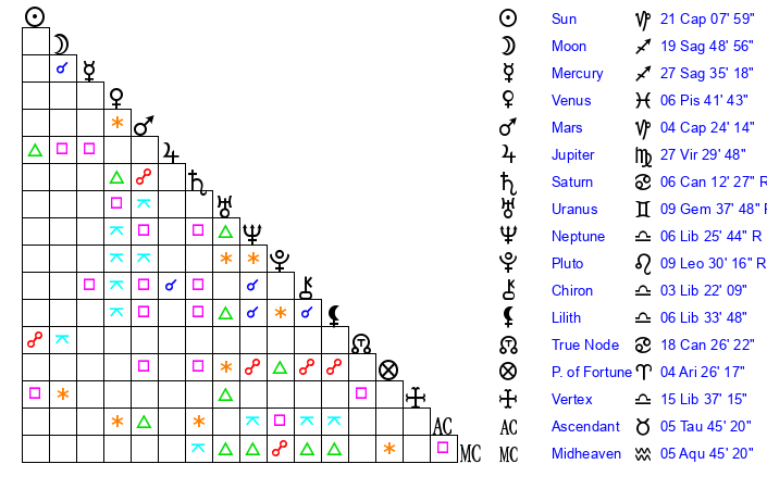 | Moon | 19 Sagittarius 48 | 23 Gemini 27 | 24 Scorpio 54 |
