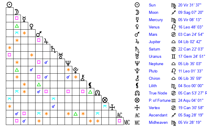 | Sun | 20 Virgo 32 | 21 Virgo 9 | 10 Sagittarius 10 |
