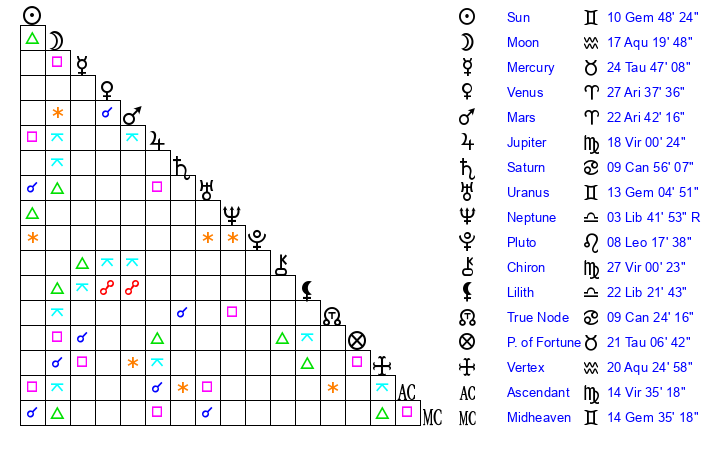 | Moon | 17 Aquarius 18 | 24 Leo 48 | 21 Capricorn 20 |