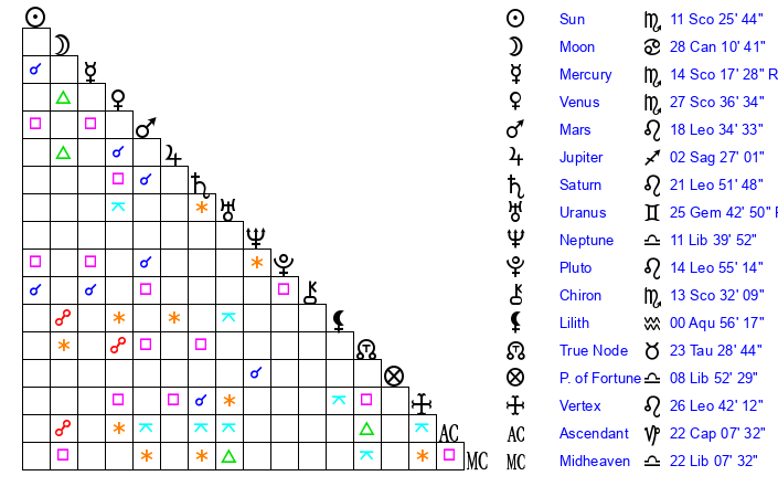 | Sun | 11 Scorpio 26 | 12 Scorpio 32 | 0 Aquarius 35 |