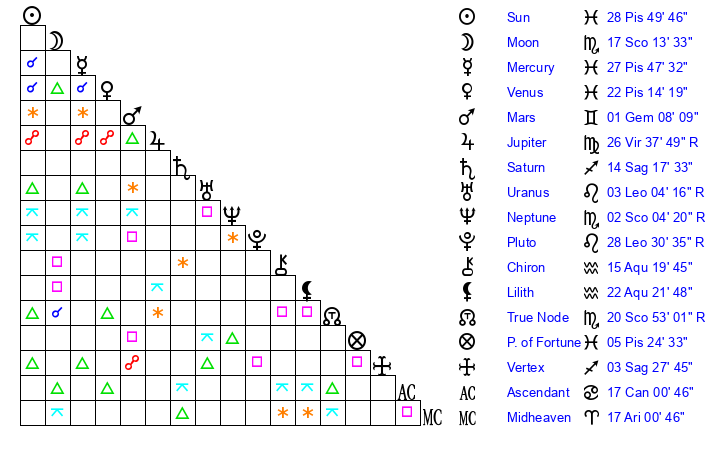 | Moon | 17 Scorpio 10 | 28 Scorpio 12 | 1 Taurus 10 |