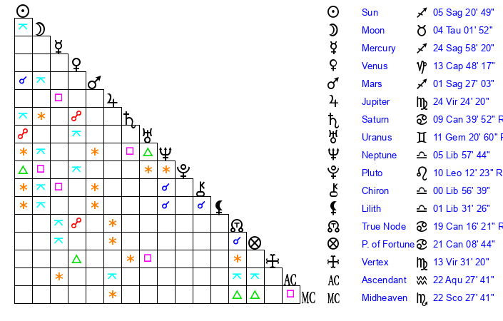 | Neptune | 5 Libra 59 | 29 Pisces 24 | 6 Libra 1 |