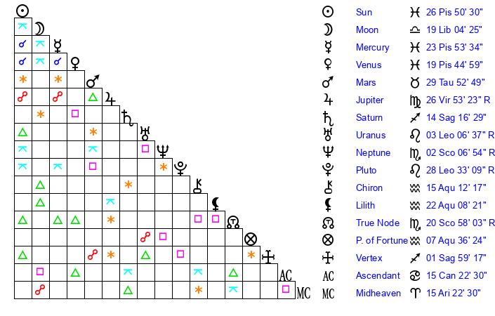 | Sun | 26 Pisces 50 | 27 Pisces 21 | 3 Gemini 14 |
