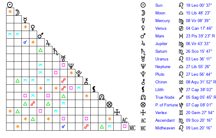 | Moon | 15 Libra 54 | 5 Pisces 50 | 13 Aries 3 |