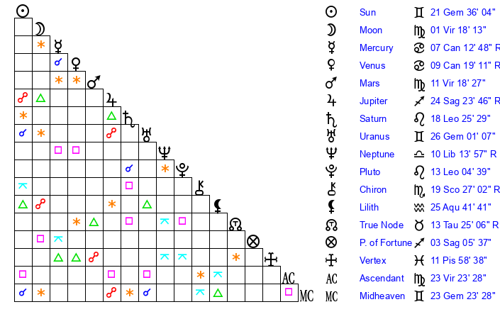 | Sun | 21 Gemini 36 | 21 Gemini 58 | 5 Virgo 16 |
