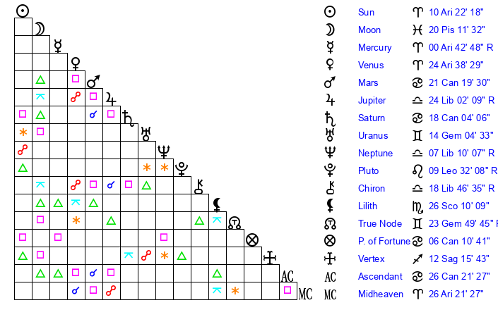 | Sun | 10 Aries 23 | 11 Aries 14 | 26 Gemini 50 |