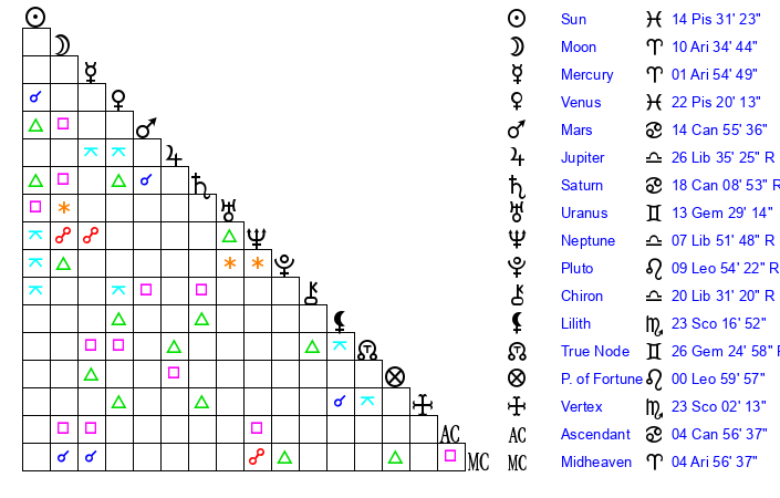 | Moon | 10 Aries 31 | 2 Gemini 39 | 26 Aquarius 12 |