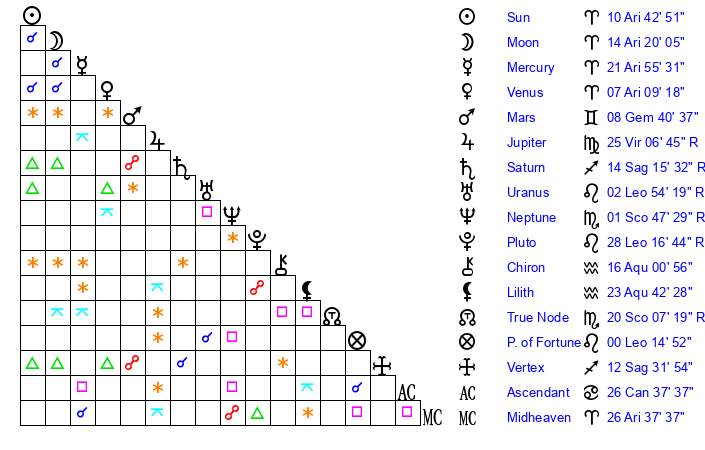 | Sun | 10 Aries 43 | 11 Aries 14 | 16 Gemini 39 |