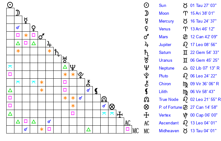 | Sun | 1 Taurus 27 | 1 Taurus 50 | 19 Cancer 14 |