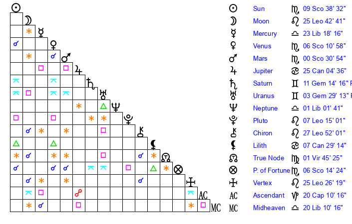 | Sun | 9 Scorpio 39 | 10 Scorpio 31 | 3 Aquarius 51 |