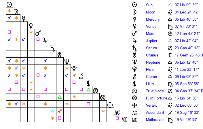 | Neptune | 6 Libra 13 | 0 Aries 32 | 8 Libra 30 |