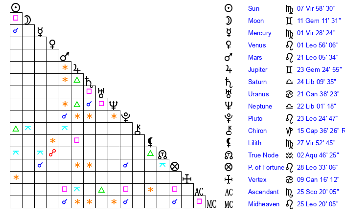 | Moon | 11 Gemini 12 | 13 Sagittarius 23 | 16 Capricorn 32 |