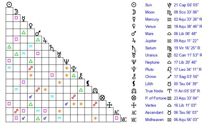 | Venus | 18 Aquarius 39 | 23 Capricorn 56 | 22 Aquarius 47 |
