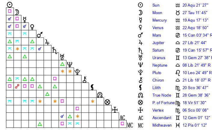 | Mercury | 19 Aquarius 18 | 21 Aquarius 21 | 12 Aries 32 |