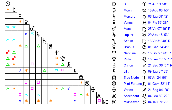 | Saturn | 14 Virgo 5 | 25 Pisces 40 | 14 Virgo 31 |