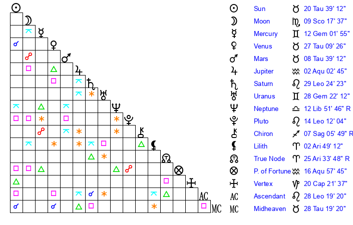 | Sun | 20 Taurus 39 | 21 Taurus 15 | 3 Leo 21 |