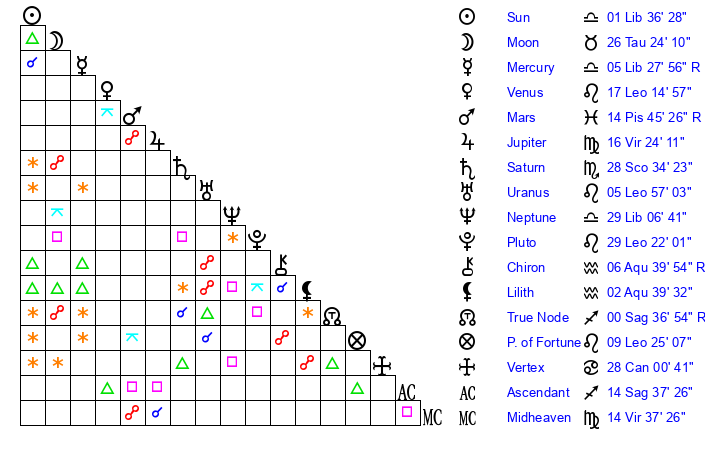| Moon | 26 Taurus 20 | 3 Scorpio 59 | 14 Sagittarius 38 |
