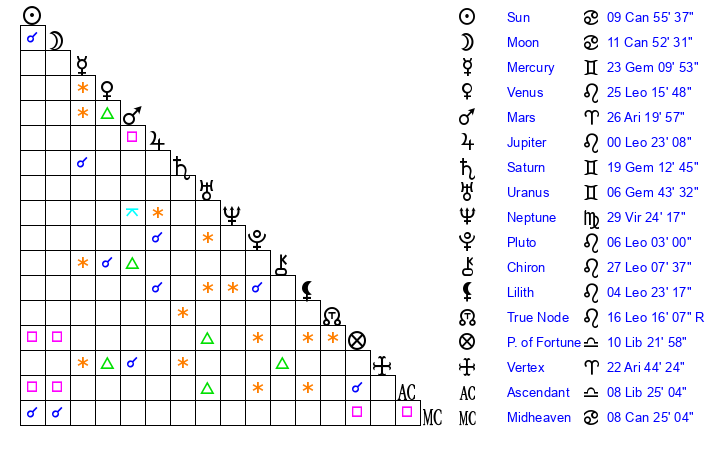 | Moon | 11 Cancer 47 | 9 Libra 59 | 14 Cancer 34 |