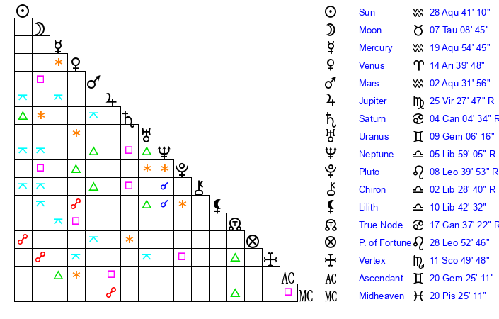 | Sun | 28 Aquarius 41 | 29 Aquarius 17 | 17 Taurus 43 |