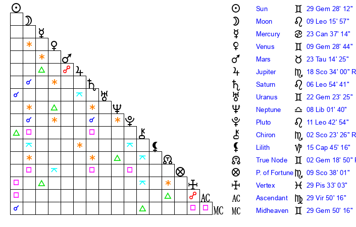 | Sun | 29 Gemini 28 | 0 Cancer 34 | 14 Virgo 13 |