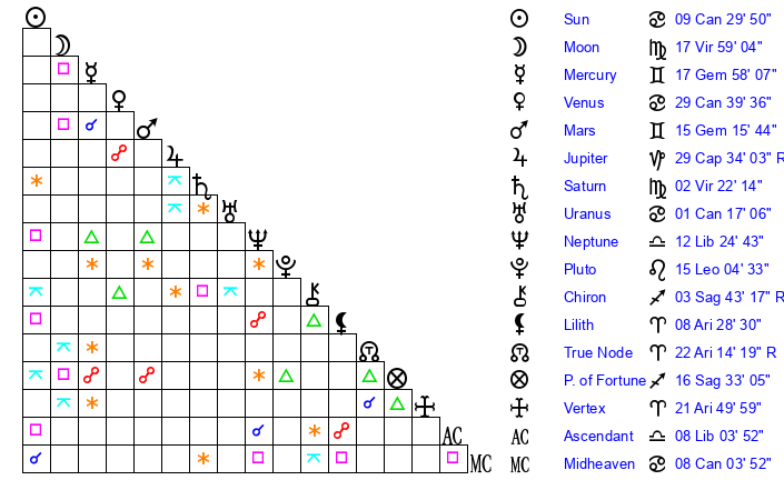 | Mercury | 17 Gemini 58 | 5 Leo 53 | 17 Libra 40 |