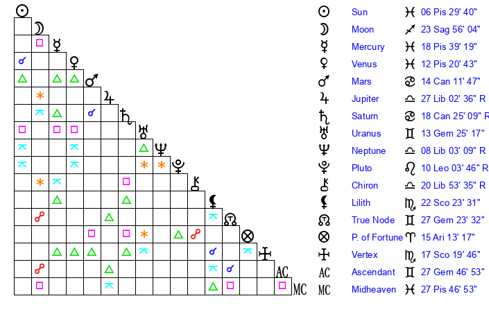 | Saturn | 18 Cancer 51 | 20 Pisces 13 | 21 Cancer 4 |