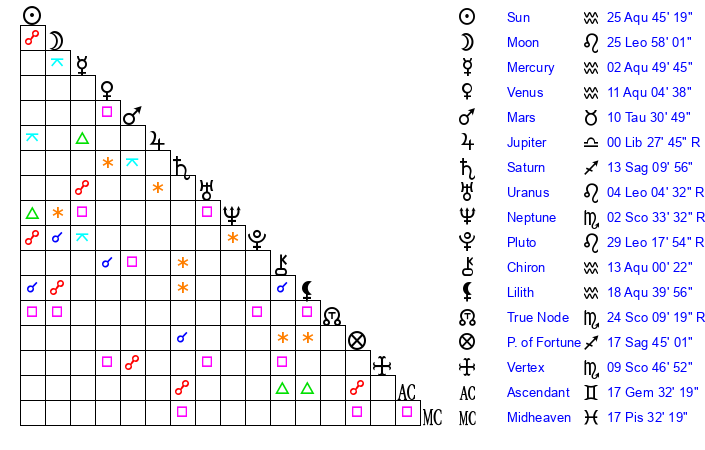 | Sun | 25 Aquarius 45 | 26 Aquarius 15 | 3 Taurus 16 |