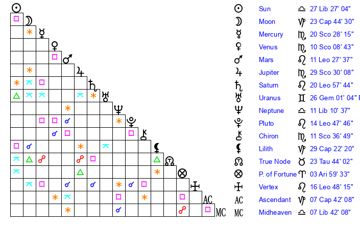 | Sun | 27 Libra 27 | 28 Libra 33 | 16 Capricorn 19 |
