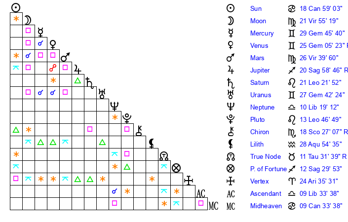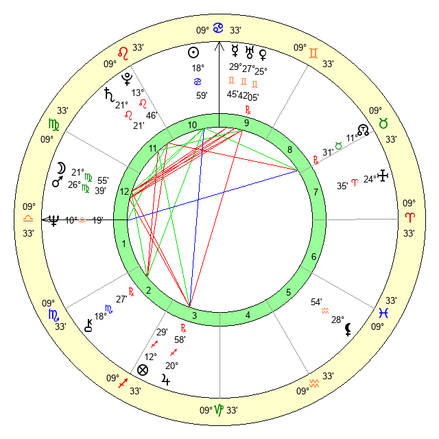 | Moon | 21 Virgo 56 | 26 Capricorn 6 | 5 Cancer 39 |