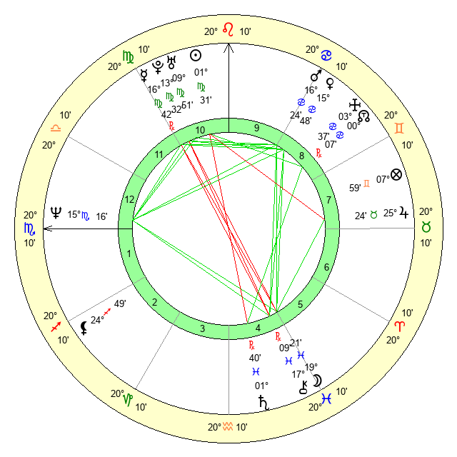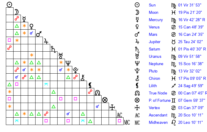 | Mercury | 16 Virgo 42 | 14 Leo 36 | 7 Scorpio 11 |